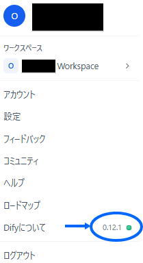 Difyバージョンは、Difyを再度起動しログインした後の画面右上のアカウントをクリックして表示されるメニューから確認できます。