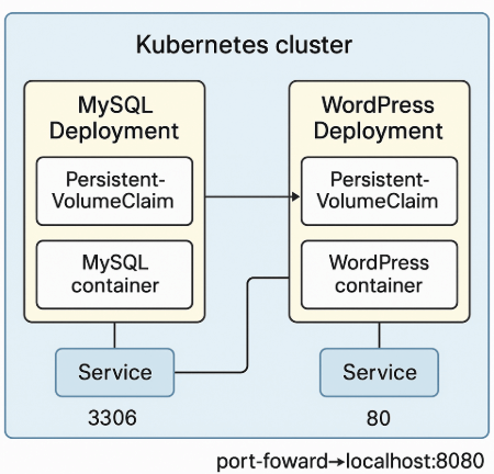 以下は、Docker Compose で立ち上げている WordPress+MySQL 環境を Kubernetes マニフェストに置き換え、Docker Desktop の Kubernetes クラスタ上で起動するまでの手順です。