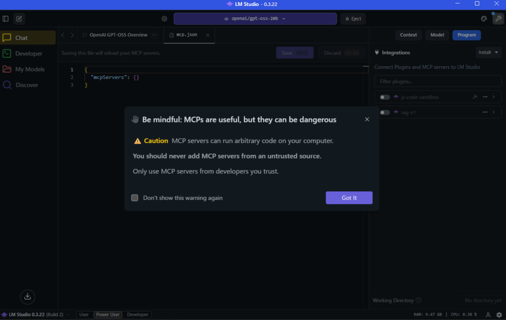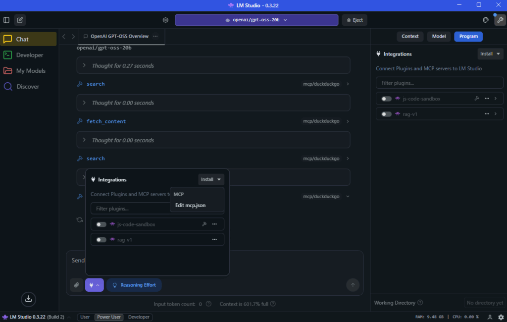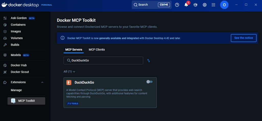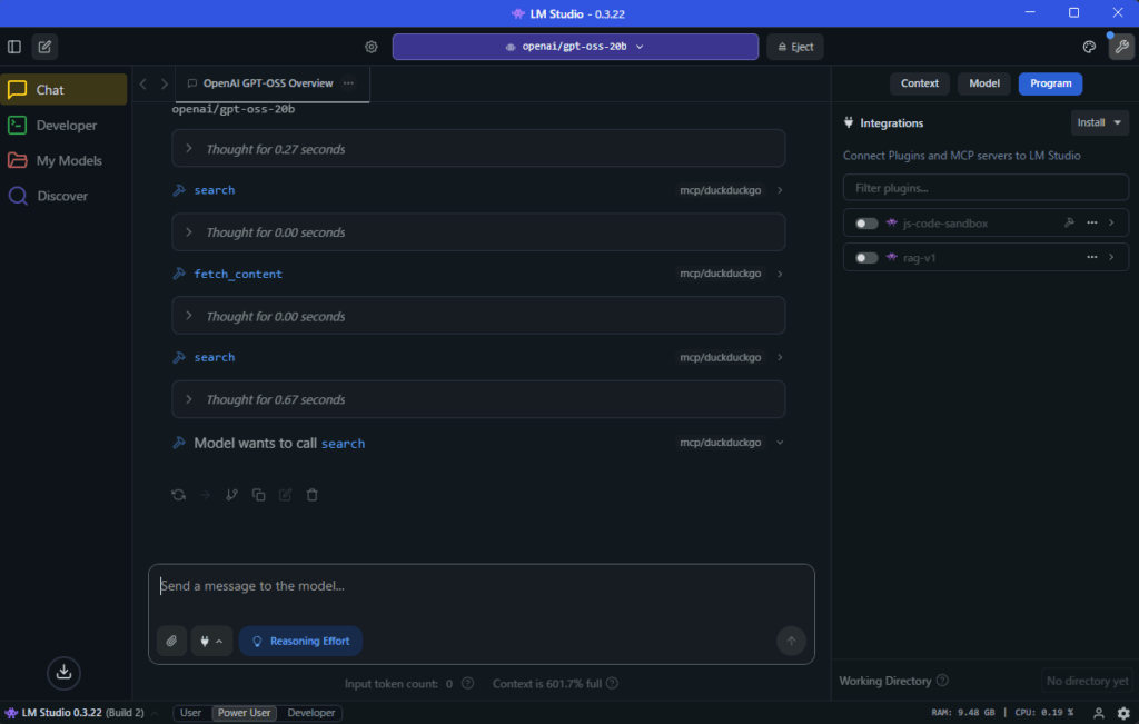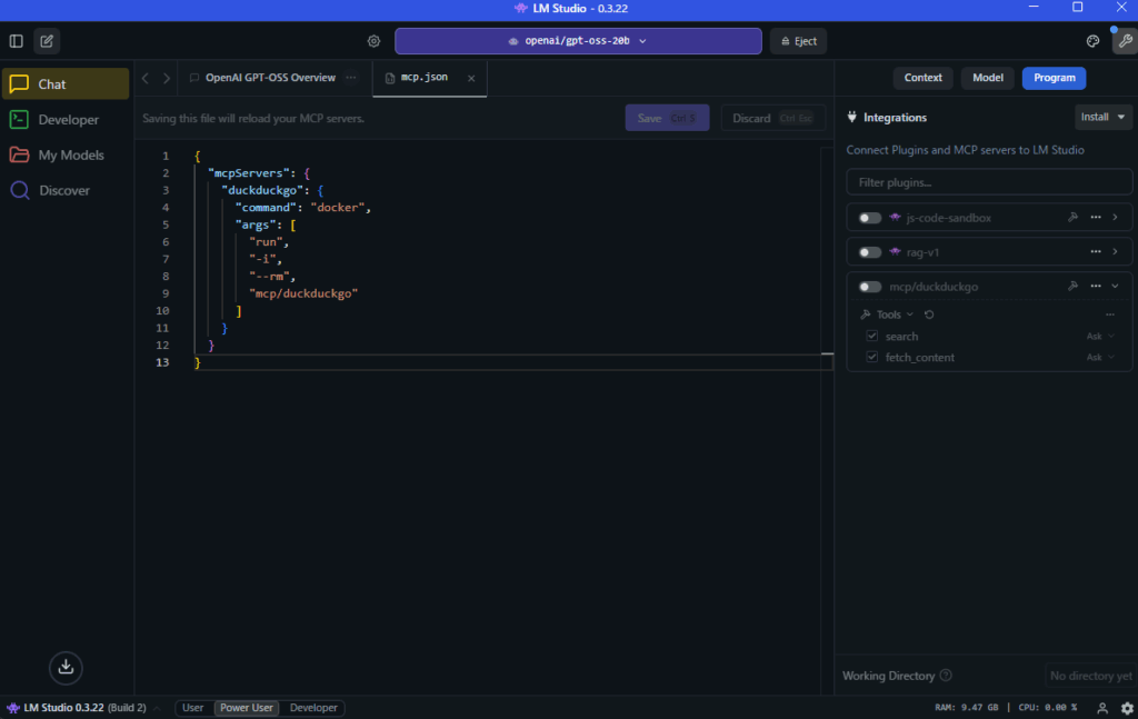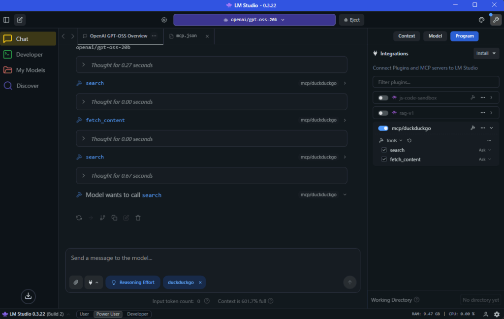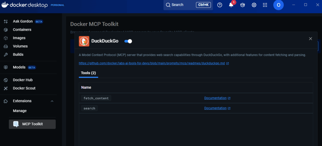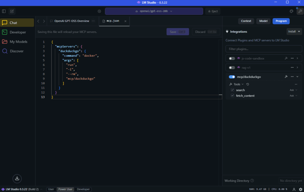 本記事では、LM Studio にインストールした gpt-oss 20B に、Docker DesktopのMCP Toolkit を利用して DuckDuckGo MCPサーバー を導入し、Web検索機能を追加する手順を解説しました。