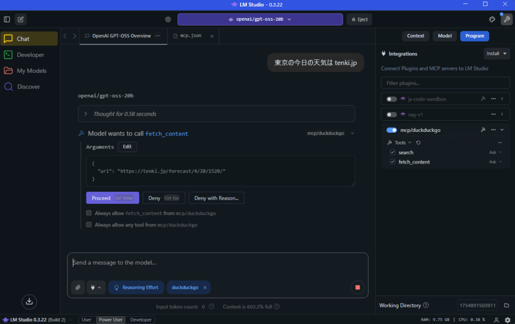 gpt-ossが、DuckDuckGoのfetch_contentを実行する確認画面を表示する。