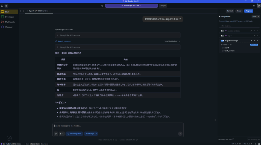 LM Studioとgpt-oss 20Bの概要から始まり、Docker DesktopでのMCPサーバーの設定方法、LM Studio側でのmcp.json編集・ツール許可設定、そして実際に検索・ページ要約を行う流れまでを順を追って紹介しました。